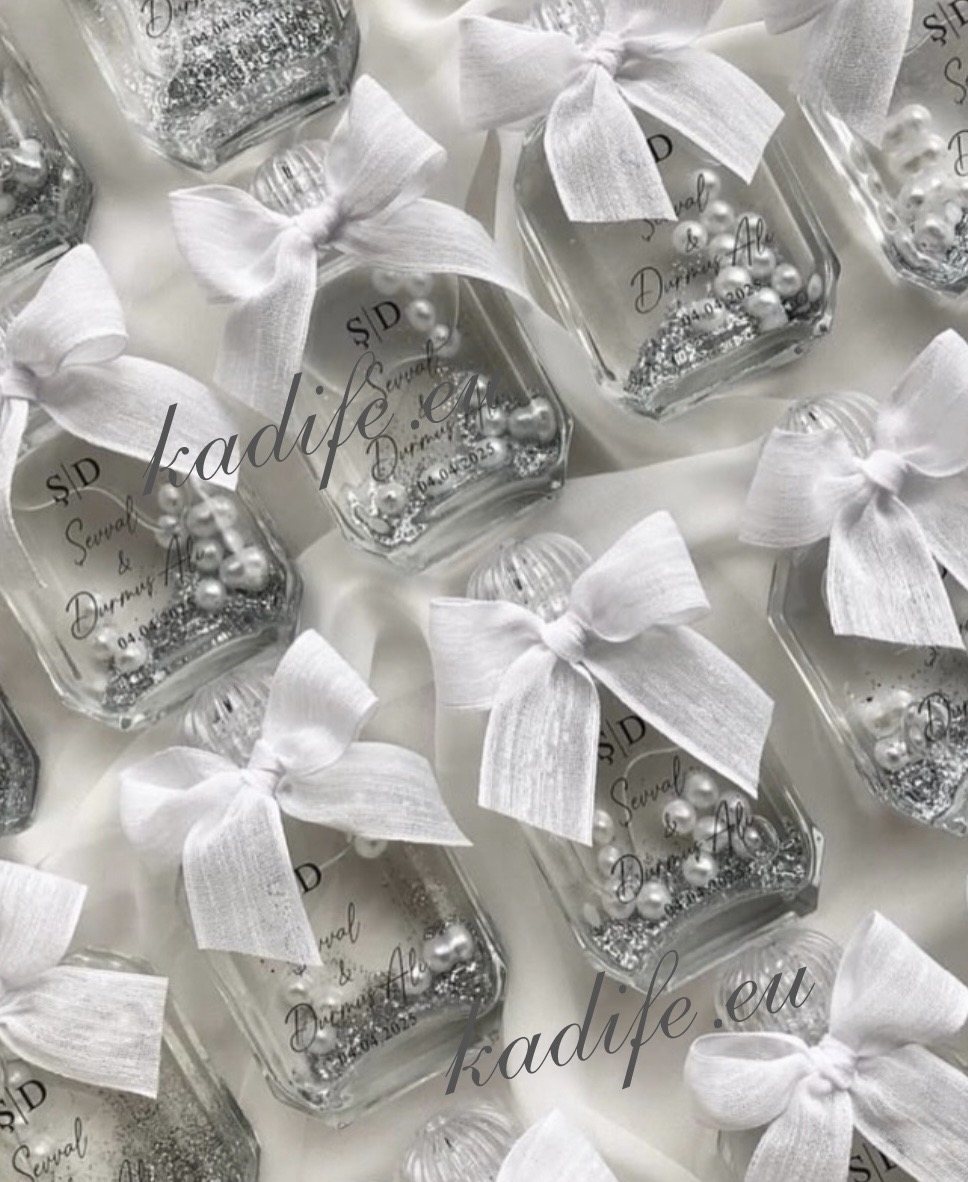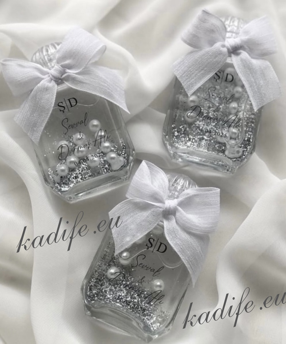 Изящно стъклено ароматно шише (50 мл), изпълнено с фин аромат и декорирано с нежно цвете и персонализиран стикер с имена и дата на събитието. Перфектен детайл, който придава стил и чар на всяко тържество.