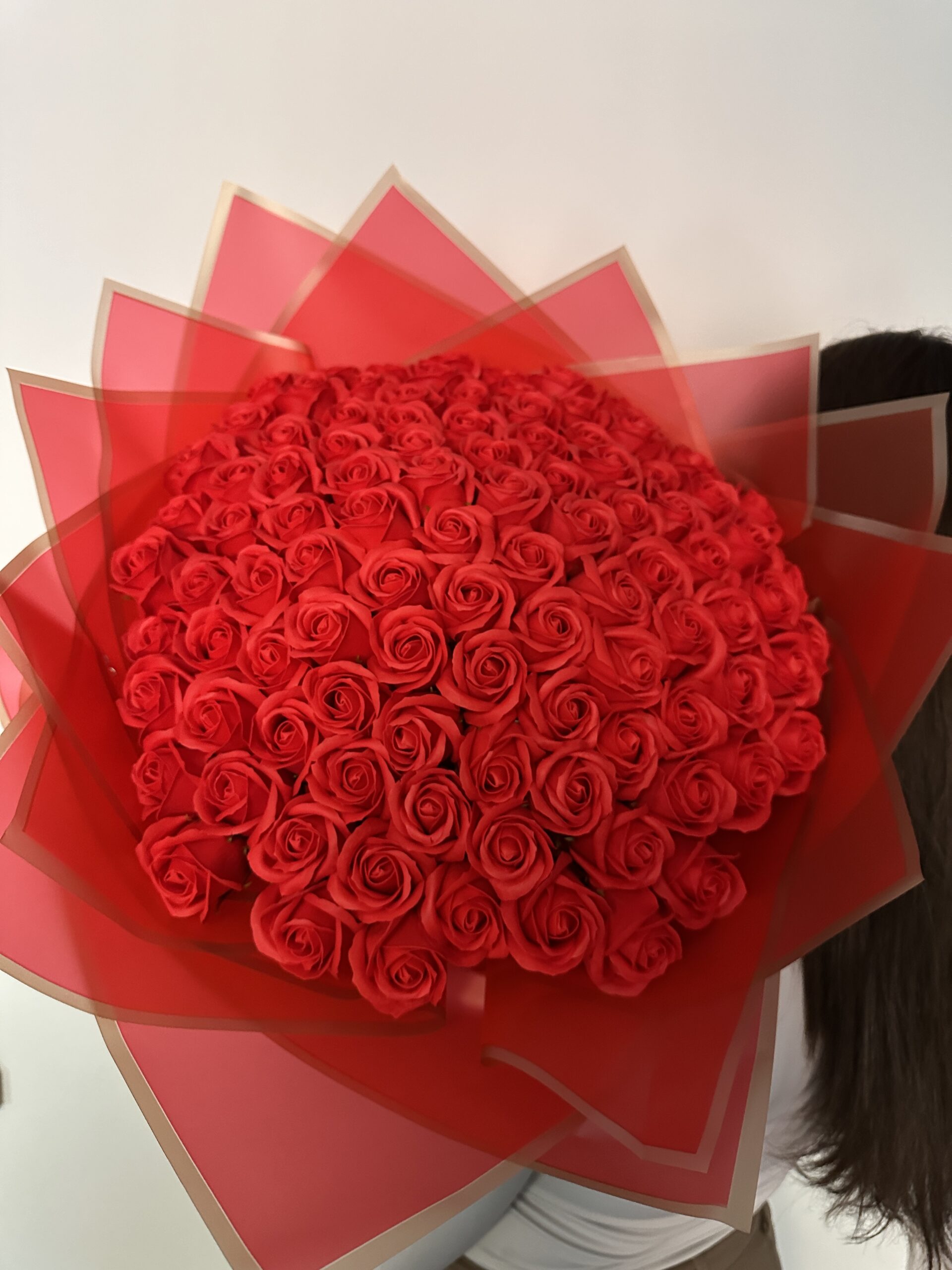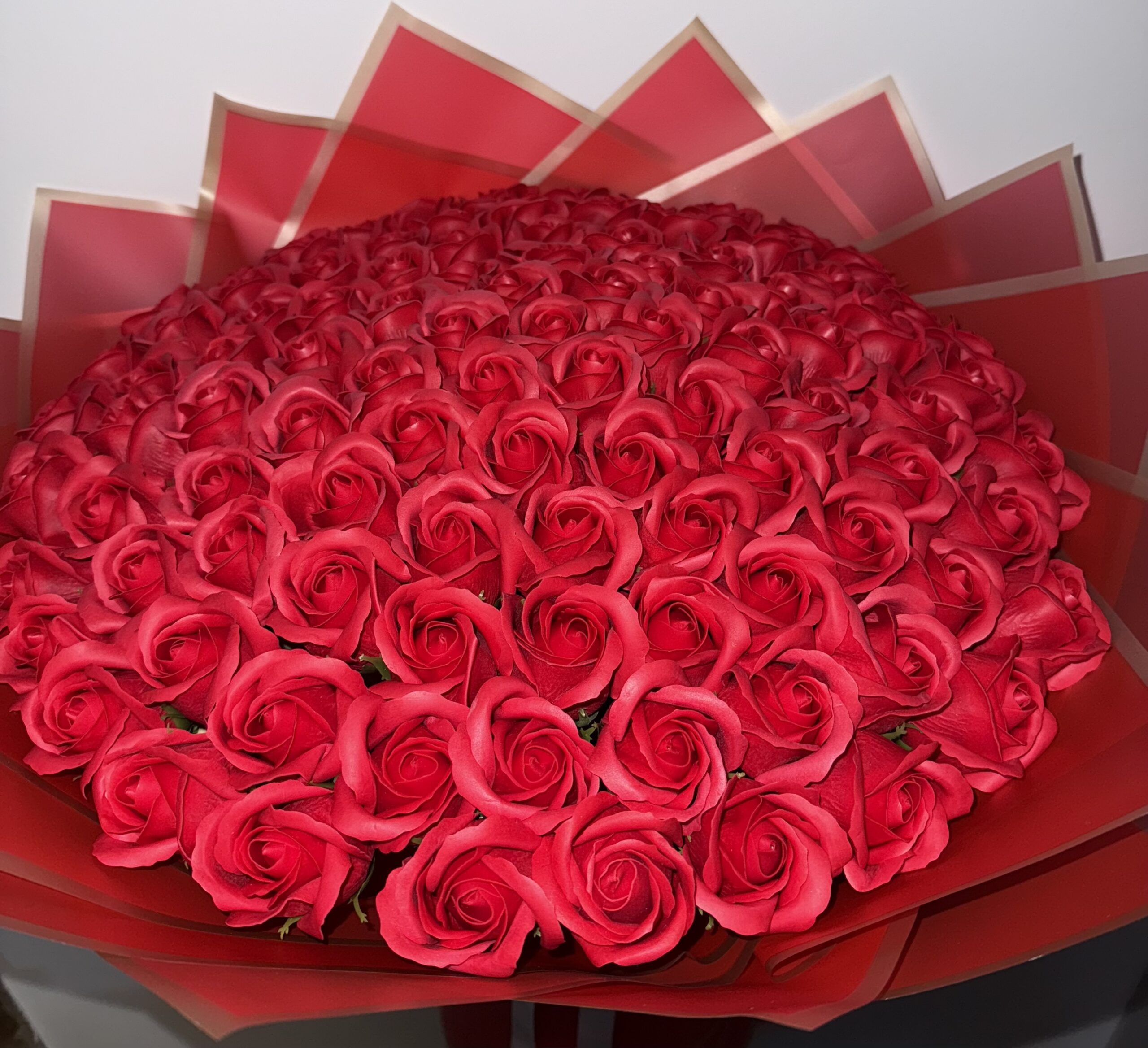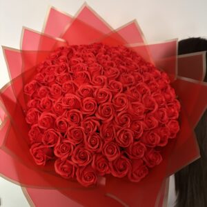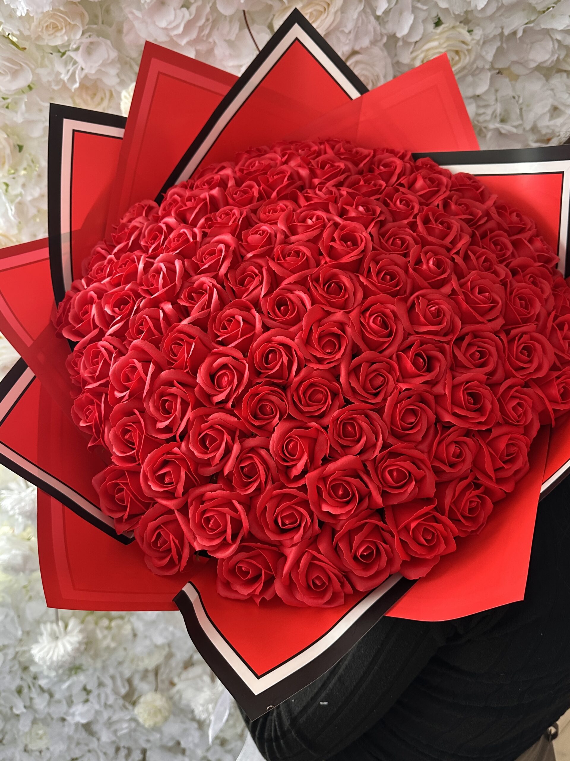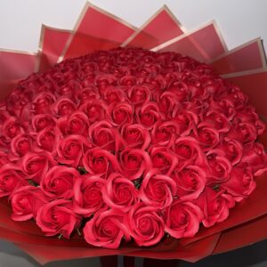 Този впечатляващ букет от 101 свежи рози е символ на обич, нежност и романтика.