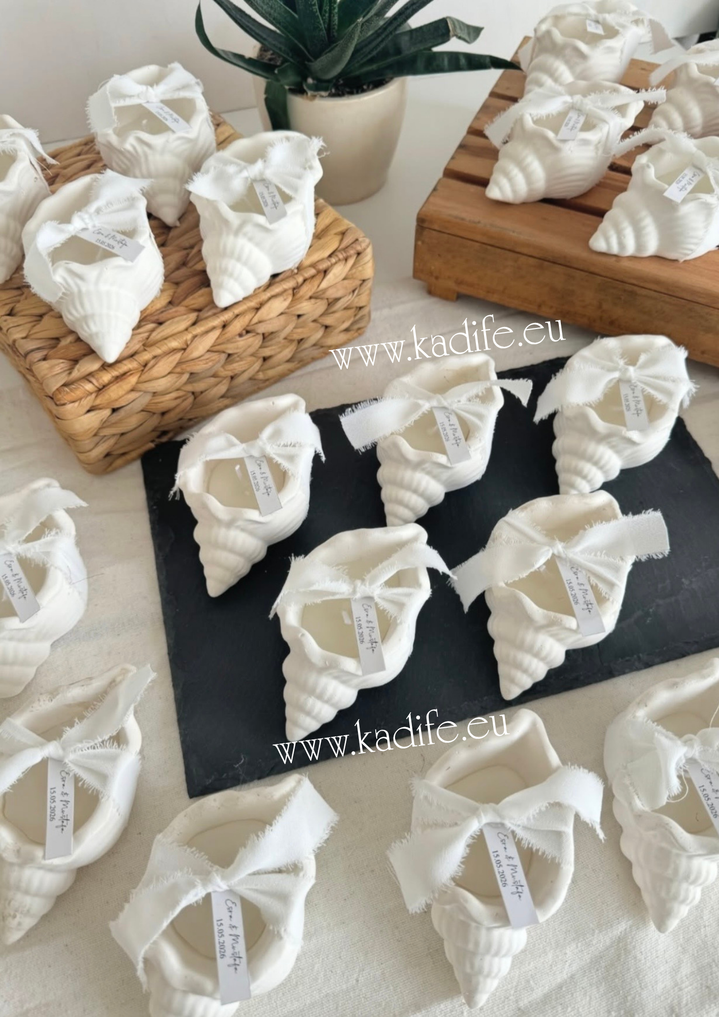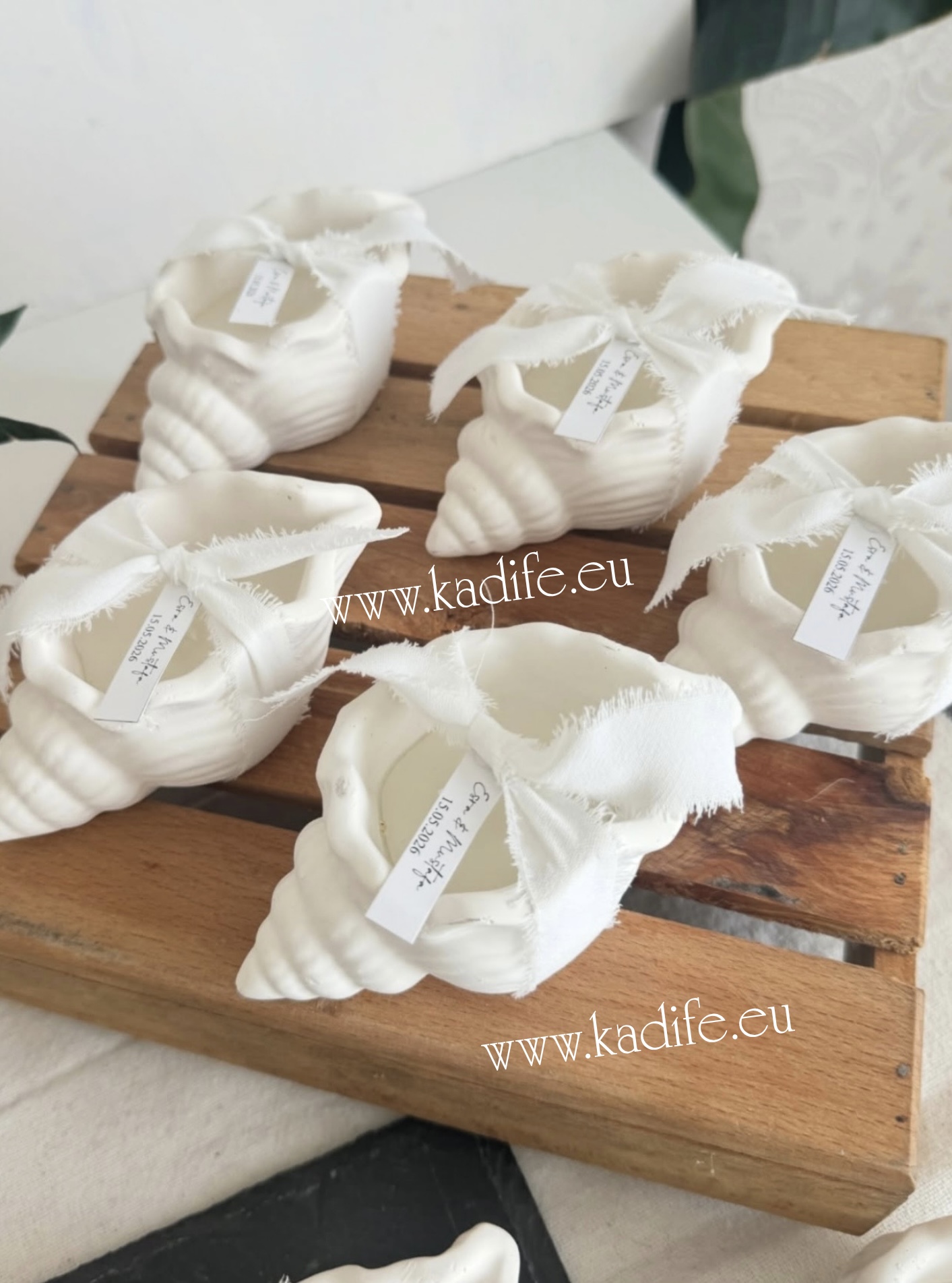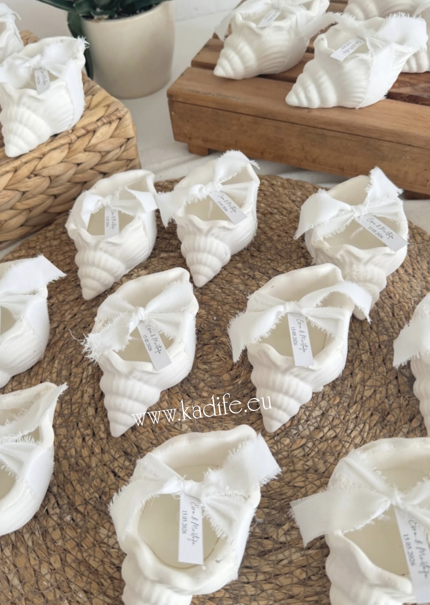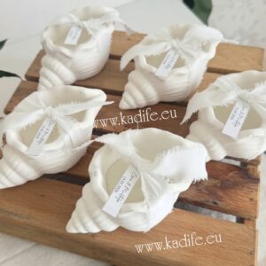Морски подаръци за гости. Свещ рапан с нежна декорация и ваш стикер.