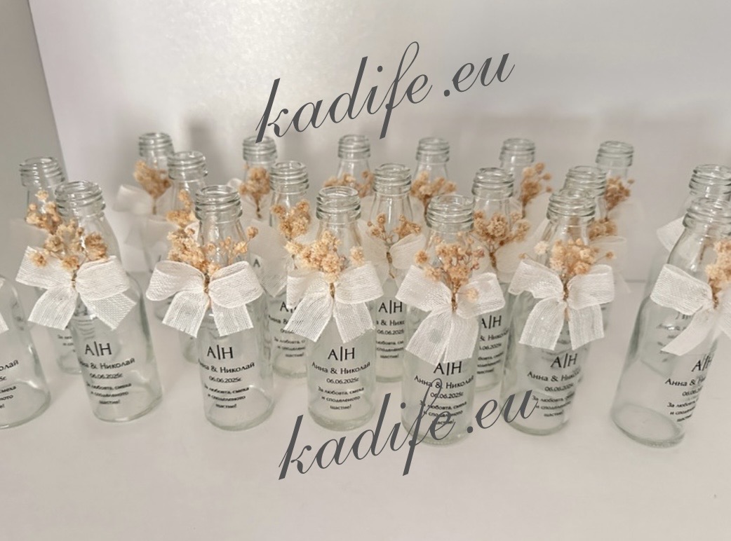 Стъклени и декорирани шишета. Идеален подарък за вашите гости. Може да се добави текст по ваш избор.