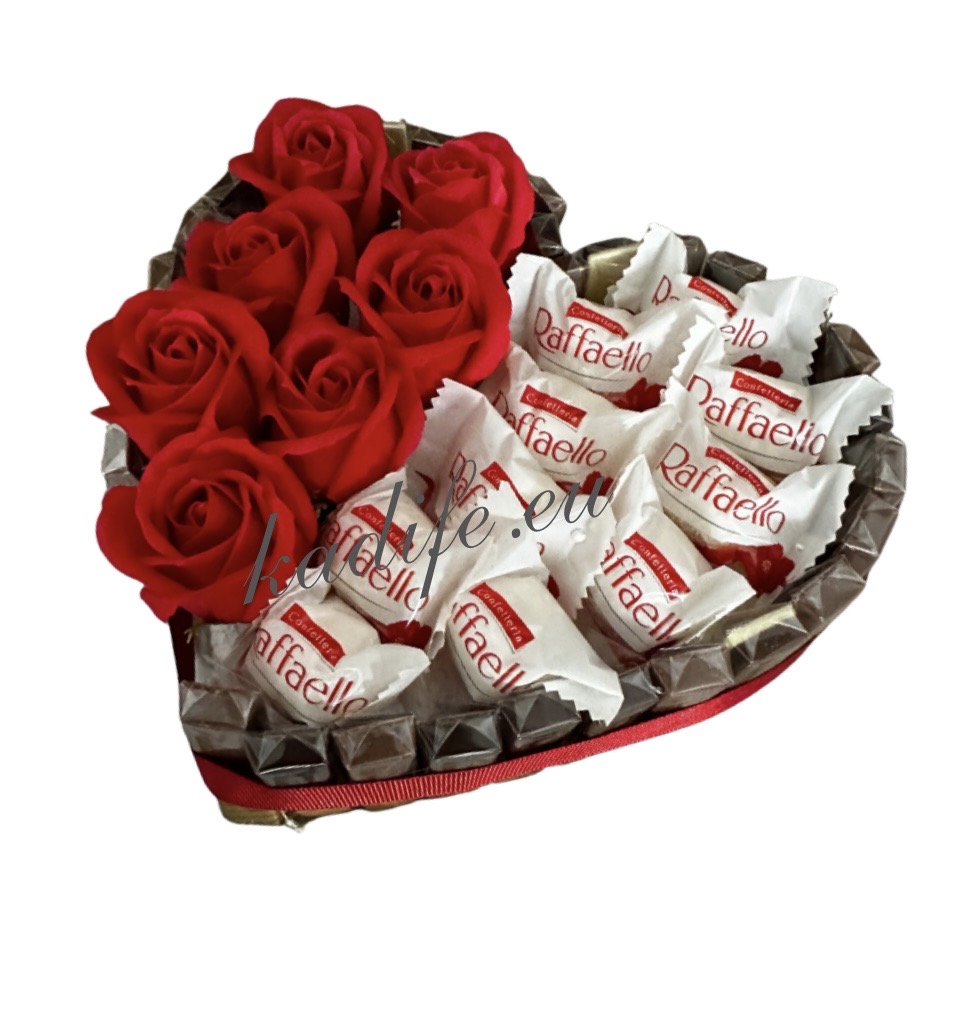 Шоколадово изкуство. Голямо сърце обвито в шоколади “Мерси” с вечни рози и допълнително бонбони “Фереро роше”. Направете празника ви запомнящ се!